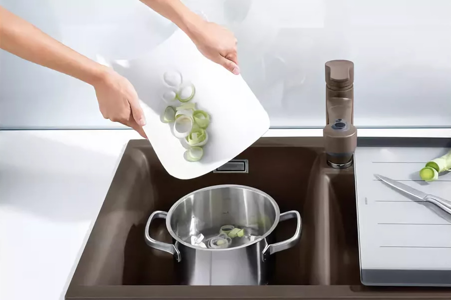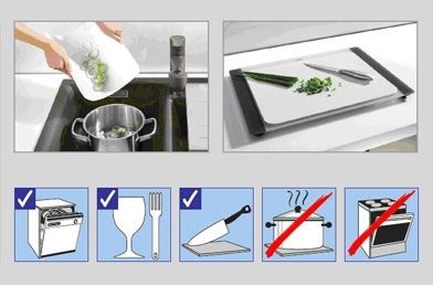 Выполнена из экологичного материала. Плотный пластик выдерживает нагрузку ножей и при этом не затупляет поверхность лезвия ножа. Гибкость доски позволяет переносить или скидывать мелко нарезанные овощи, зелень, фрукты и т.д. в кастрюли, бутыли или графины даже с маленьким диаметром горловины. Достаточно просто согнуть доску.