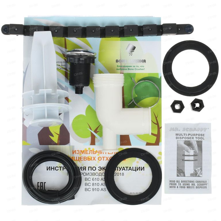 В комплекте бытовых моделей есть Мr. Scrappy-это многофункциональный инструмент, который используется и как ручной скребок, для удаления пищи с посуды и как проталкиватель, для продвижения отходов в измельчитель (диспоузер). Так же он выполняет функцию сливной пробки для закрытия отверстия мойки. Мr. Scrappy защищает столовые приборы и другие мелкие детали от попадания в измельчитель пищевых отходов . При этом сток воды в мойке происходит в нормальном режиме. Каждый пользователь измельчителя пищевых отходов найдет этот продукт для себя очень удобным и полезным. Подходит для мытья в посудомоечной машине. Мr. Scrappy всегда под рукой, т.к. находится всегда в мойке.